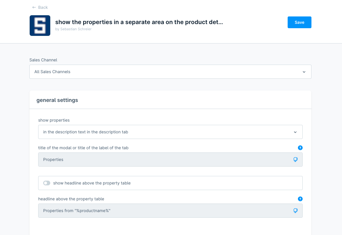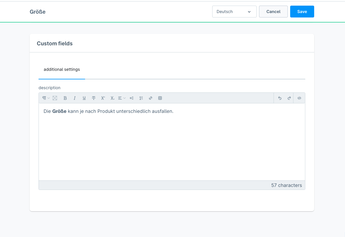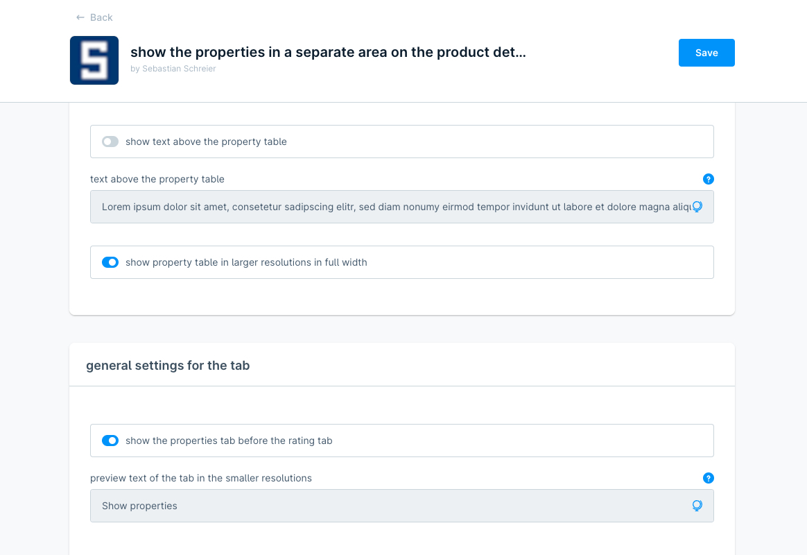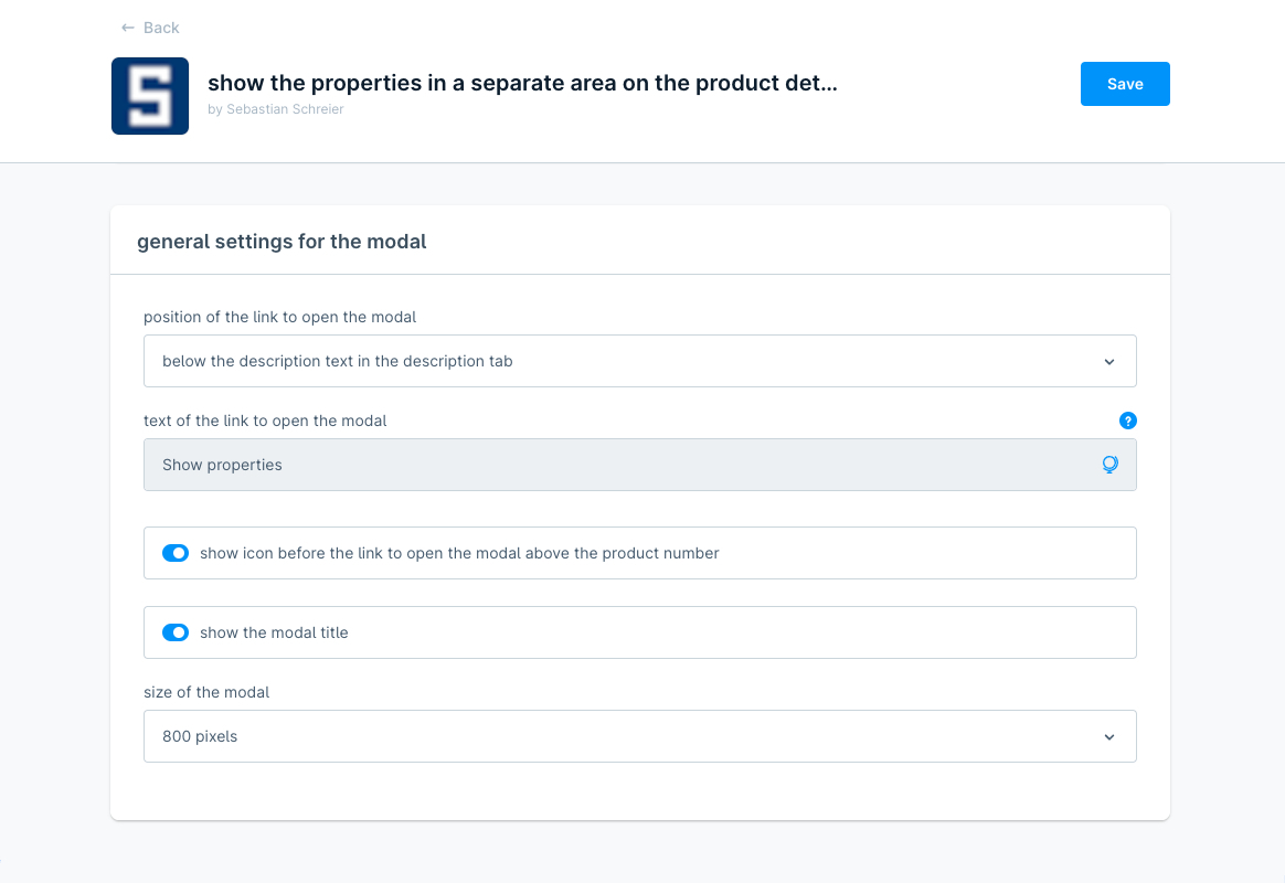 Innerhalb der Konfiguration kann dazu ausgewählt werden, ob der eigene Bereich entweder ein eigener Tab oder eine Modalbox sein soll, die über einen Link erreichbar ist. Den Tab kann man sich vor oder nach dem Bewertungen-Tab anzeigen lassen. Der Link zum Öffnen der Modalbox kann entweder oberhalb der In den Warenkorb-Schaltfläche, oberhalb der Produktnummer oder unterhalb des Beschreibungstextes im Tab Beschreibung platziert werden. Weiterhin kann man auch die Größe der Modalbox (300 Pixel, 500 Pixel, 800 Pixel und 1140 Pixel) bestimmen und ob der Titel der Modalbox angezeigt werden soll.