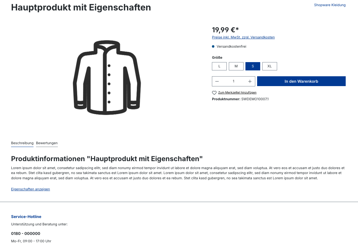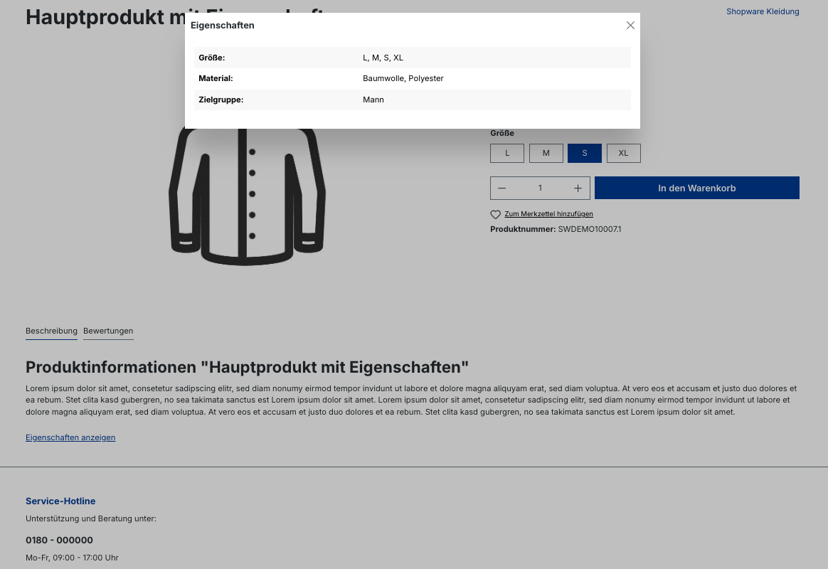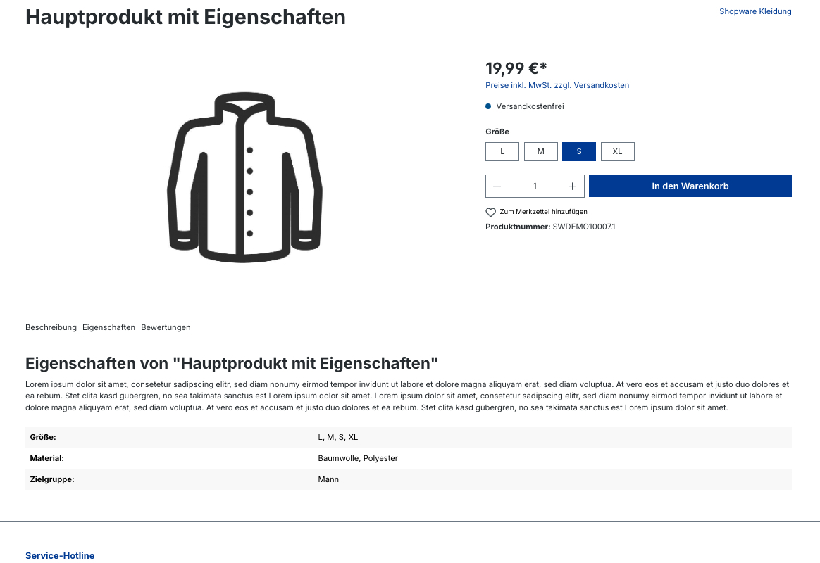 Die Shopware 6 - App "Anzeige der Eigenschaften in einem eigenen Bereich auf der Produkt - Detailseite" ermöglicht es, Eigenschaften in einem eigenen Bereich auf der Produkt - Detailseite anzeigen zu lassen.