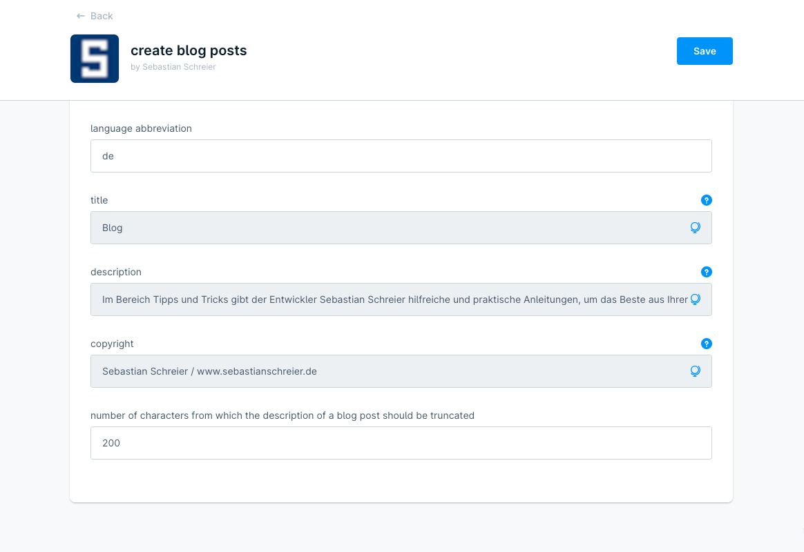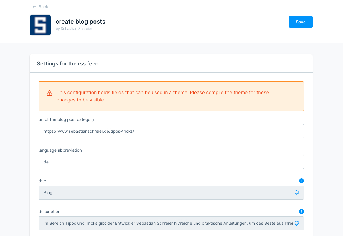 Ein RSS Feed befindet sich im Pfad /rss, also unter http://ihre-domain.de/rss. Die URL der Blogbeitragskategorie, das Sprachkürzel, der Titel, die Beschreibung und das Copyright für den RSS Feed kann man innerhalb der Konfiguration festlegen.
