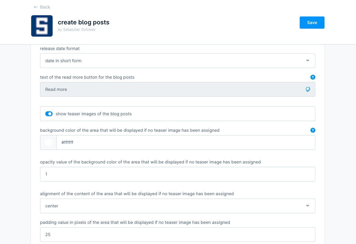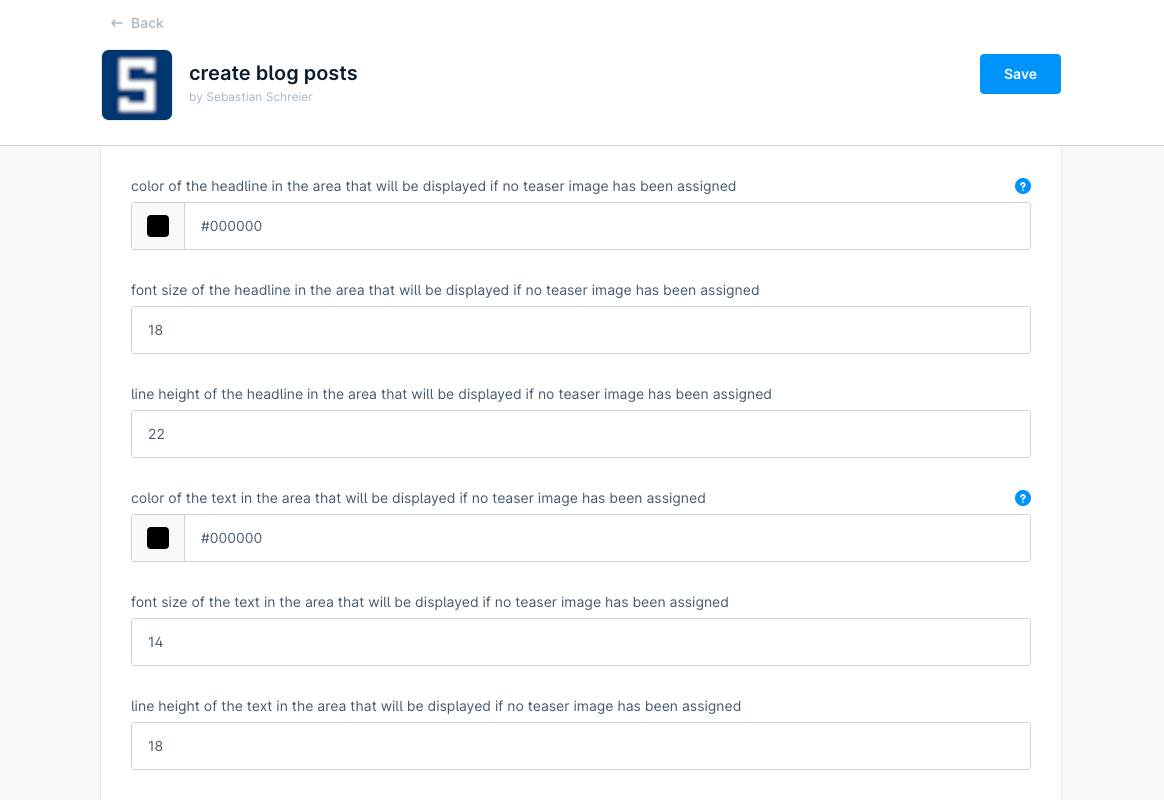 Außerdem kann für die Listenansicht innerhalb der Konfiguration die Anzahl an nebeneinander platzierten Kacheln für die mobilen Ansicht (1 oder 2 Elemente), die Tablet-Ansicht (1 oder 3 Elemente) und die Desktop-Ansicht (1 oder 4 Elemente) ausgewählt werden. Darüber hinaus kann auch das Format des Veröffentlichungsdatums (Datum und Uhrzeit mit ausgeschriebenen Monatsnamen oder in Kurzform oder auch ohne Uhrzeit) des Blogbeitrags ausgewählt werden. Ebenso kann man die Anzahl an Zeilen eingeben, ab denen der Text automatisch abgeschnitten wird. Insofern kein Teaserbild für den Blogbeitrag festgelegt werden soll, kann statt dem Platzhalter ein Bereich mit einer Überschrift und einem Text angezeigt werden. Wenn dies der Fall ist, kann man folgendes festlegen: