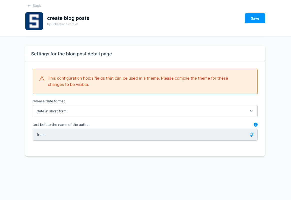 Auch für die Blogbeitragsdetailseite kann innerhalb der Konfiguration das Format des Veröffentlichungsdatums (Datum und Uhrzeit mit ausgeschriebenen Monatsnamen oder in Kurzform oder auch ohne Uhrzeit) ausgewählt werden.