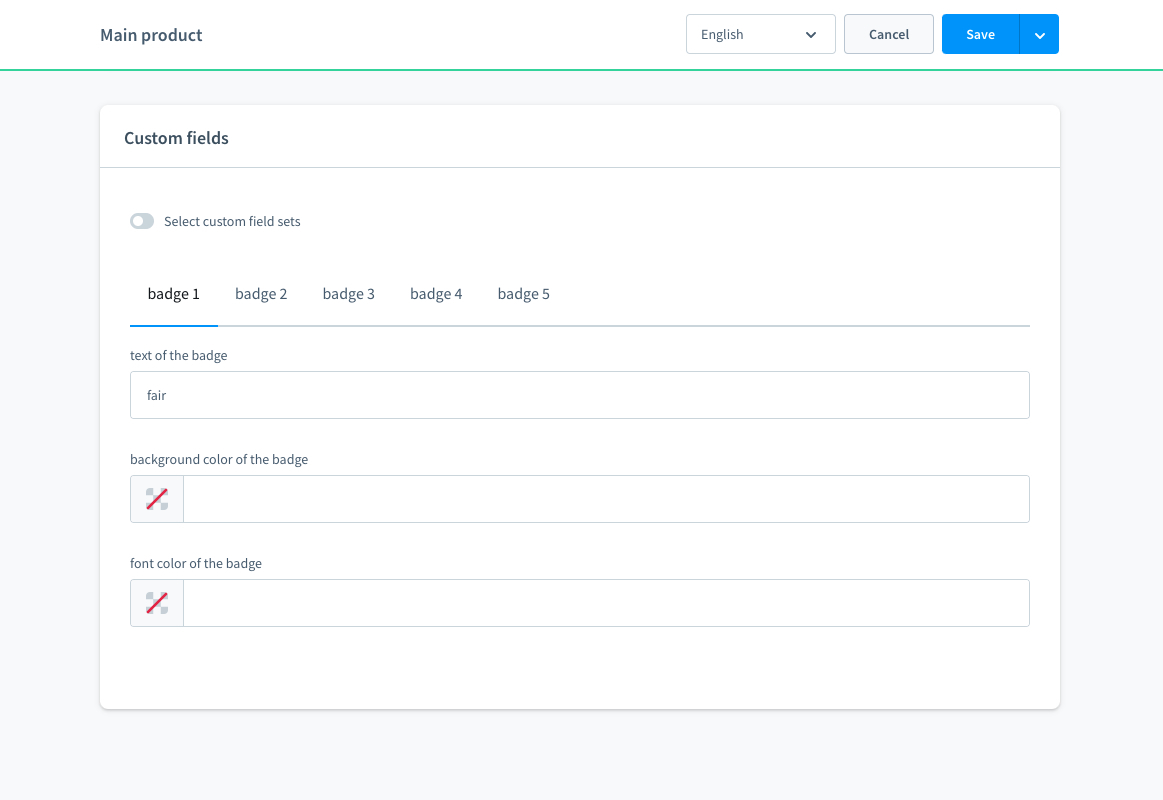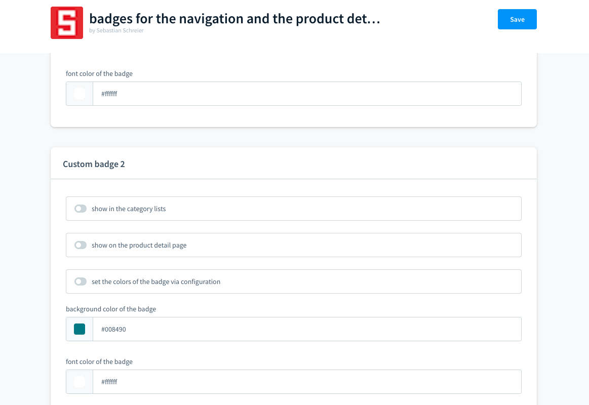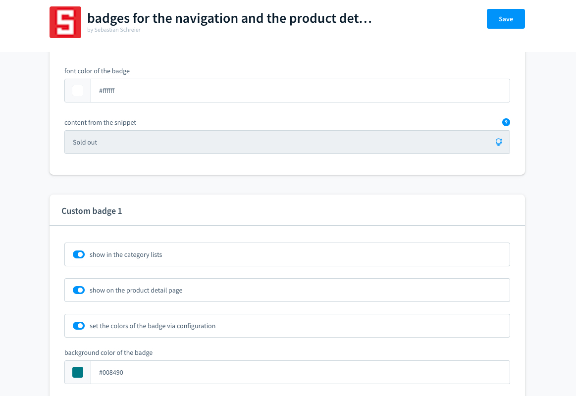 Des Weiteren hat man die Möglichkeit, die Hintergrundfarbe und die Schriftfarbe des Badges individuell je Produkt über die Zusatzfelder oder über die Konfiguration festzulegen.