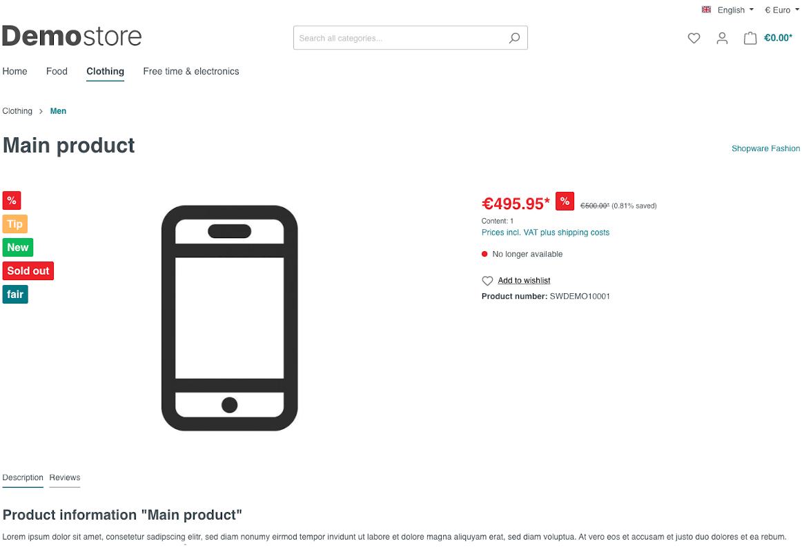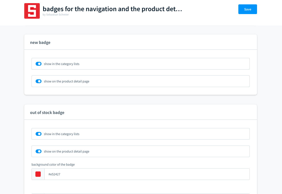 Innerhalb der Konfiguration kann ebenso festgelegt werden, ob die Standard - Badges für eine Rabattierung (%), für eine Hervorhebung (Tipp) und für neue Produkte (Neu) in den Kategorielisten und auf der Produkt-Detailseite angezeigt werden sollen. Darüber hinaus kann man sich auch ein Badge für den Ausverkauft - Status anzeigen lassen.