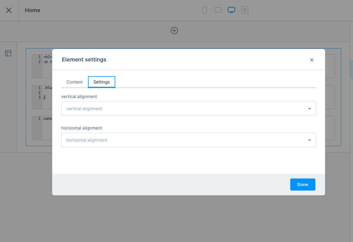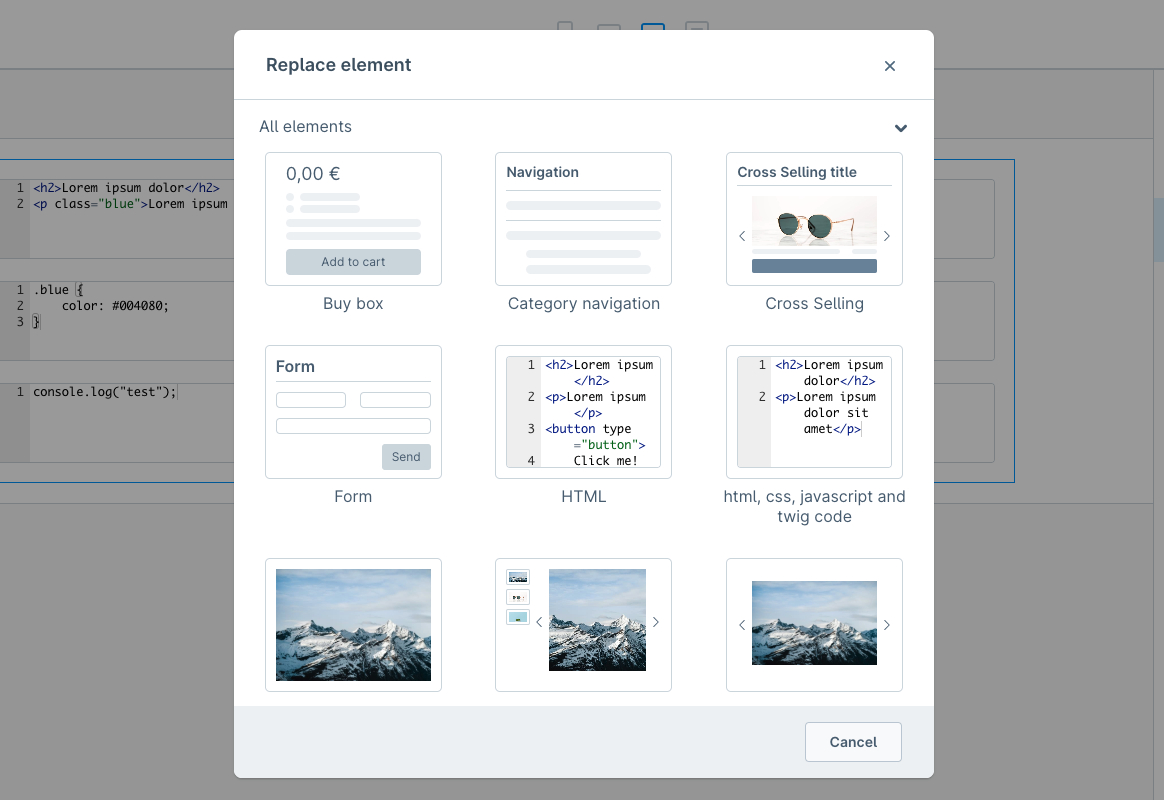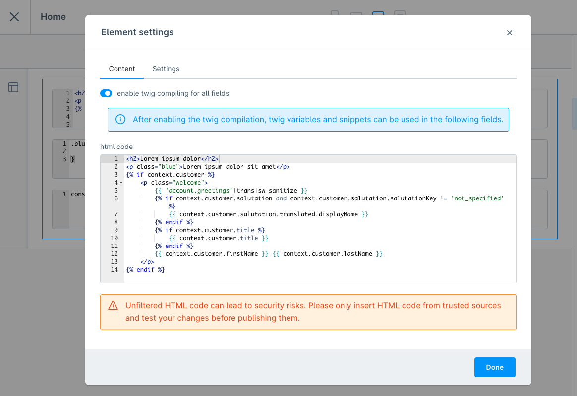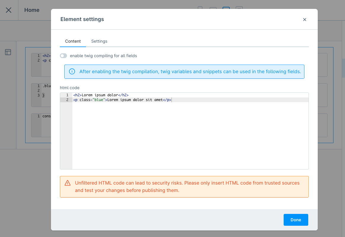 Element für HTML-, CSS-, JavaScript- und Twig-Code für die Erlebniswelten