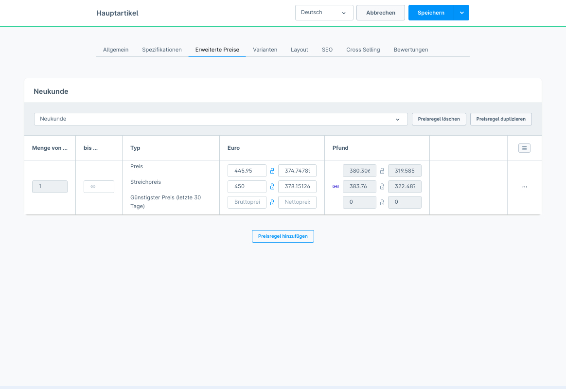 Nachdem die Regel erstellt wurde, muss sie dem betreffenden Produkt zugewiesen werden. Dazu wechselt man unter "Kataloge" und "Produkte" nach der Auswahl des Produkts in den Tab "Erweiterte Preise" und wählt dort eine sogenannte "Bedingungsregel" aus, beispielsweise "Neukunde". Im Anschluss kann für diesen Fall der Verkaufspreis, ein Streichpreis, der günstigste Preis der letzten 30 Tage und Staffelpreise sowohl in Brutto als auch in Netto festgelegt werden. Bei Bedarf kann man anschließend noch weitere Preisregeln über die Schaltfläche "Preisregel hinzufügen" hinzufügen.