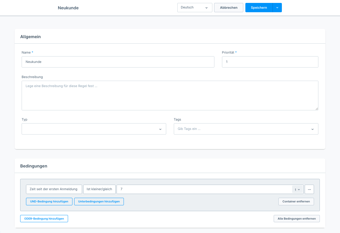 Über diese Regel gelten Kunden nur als Neukunden, die sich in den letzten 7 Tagen angemeldet haben. Für das Kundenmerkmal Kundengruppe reicht die Bedingung "Kundengruppe" mit dem Operator "Ist eine von" und beispielsweise dem Wert "Händler" aus. Für die Kundennummer oder das Tag des Kunden wählt man die Bedingung "Kundennummer" oder "Kunde mit Tag" und den Operator "Ist eine von" aus und listet im darauffolgenden Feld eine oder mehrere Kundennummern oder Tags auf.