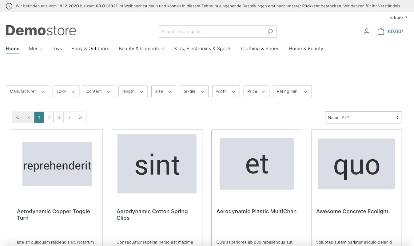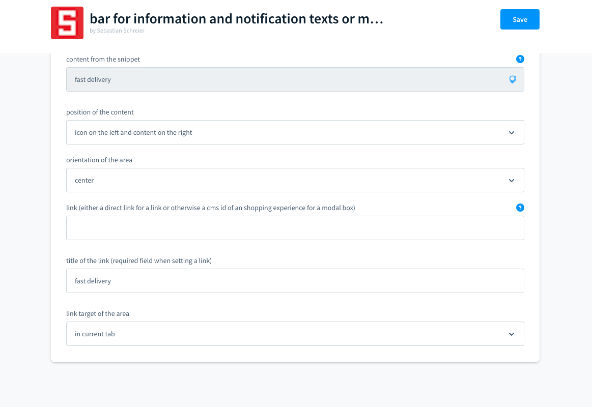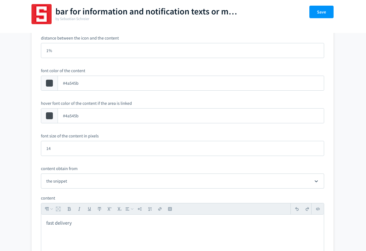 Die Shopware 6 - App "Leiste für Informations- und Hinweistexte oder Meldungen" ermöglicht unter anderem eine Leiste für Informations- und Hinweistexte oder Meldungen, die bis zu 4 Bereiche beinhalten kann. Sie kann entweder in der Topbar oder in der Footerbar oder auch oberhalb oder unterhalb der Brotkrumennavigation angezeigt werden.