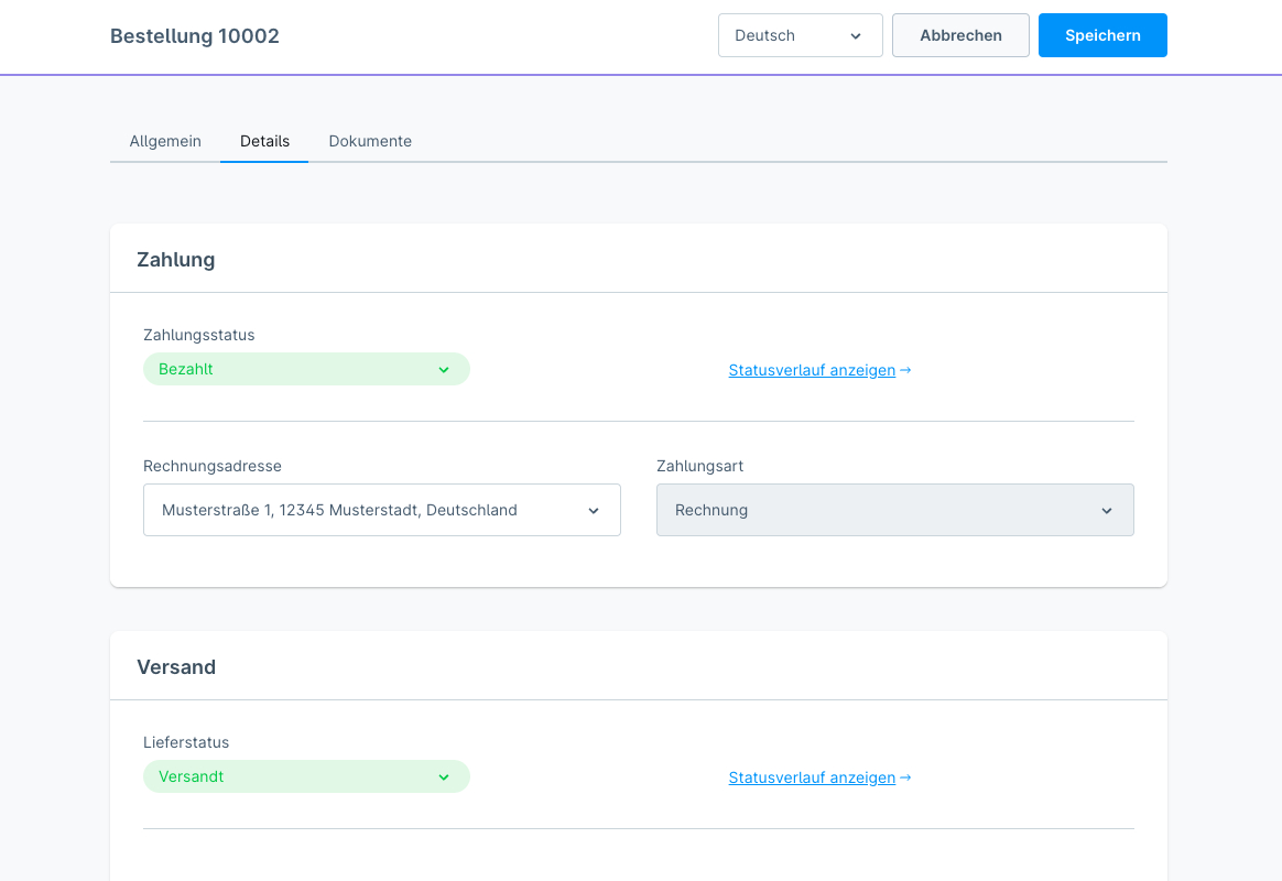 Den Zahlungsstatus kann man in Shopware 6 im Backend unter "Bestellungen" und "Übersicht" nach der Auswahl einer Bestellung im Tab "Details" im Bereich "Zahlung" beim Auswahlfeld "Zahlungsstatus" und den Lieferstatus im Bereich "Versand" beim Auswahlfeld "Lieferstatus" auswählen. Die Nummern für die Sendungsverfolgung können im Feld "Sendungsnummer(n)" zugewiesen werden. Im Anschluss sieht man die Informationen im Kundenkonto unter "Bestellungen" bei der jeweiligen Bestellung.