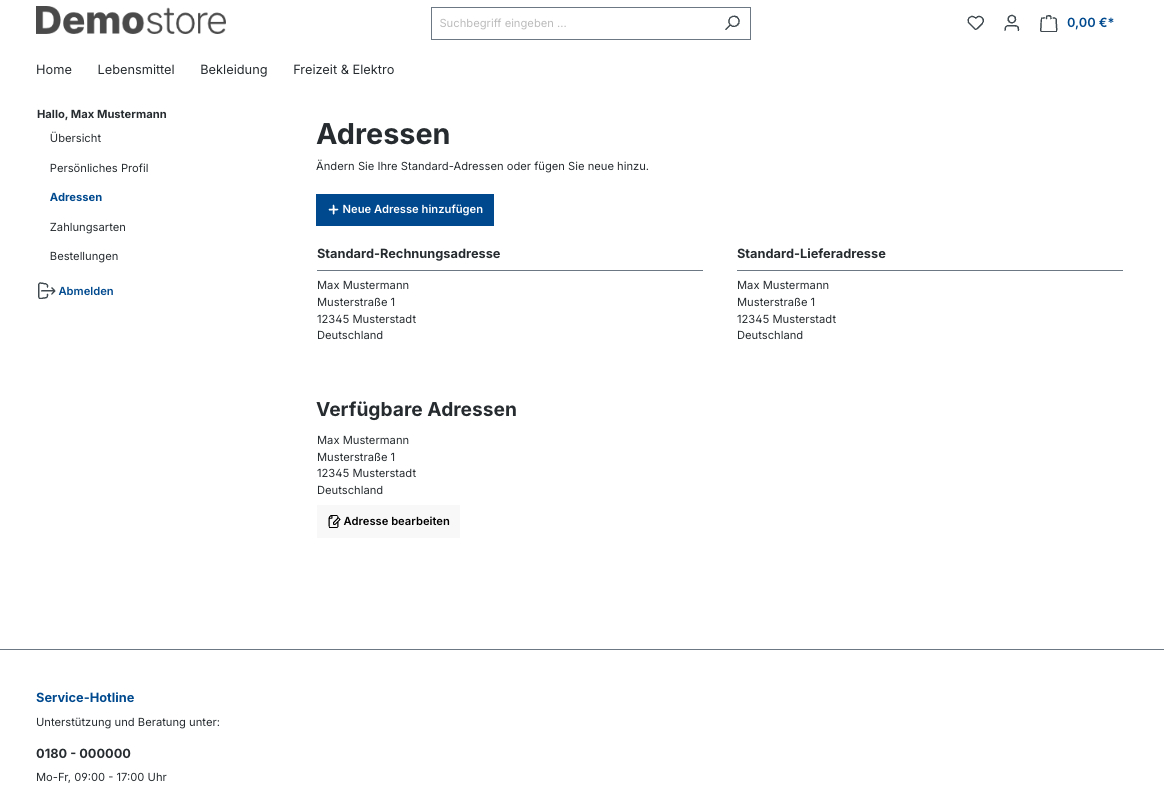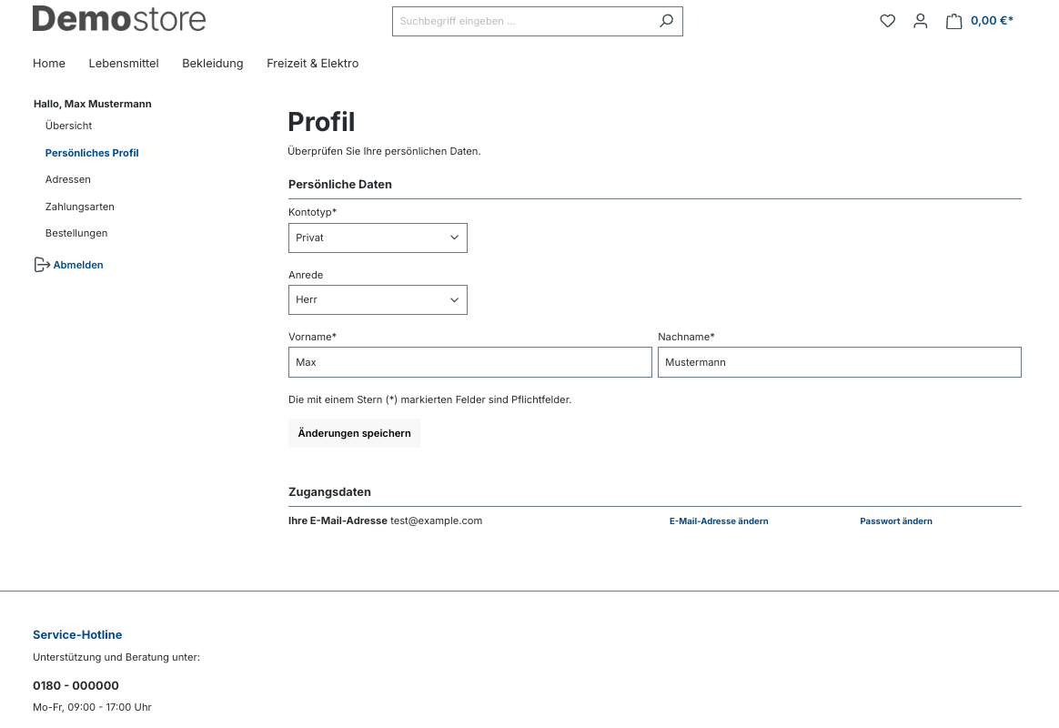 Die persönlichen Daten und die E-Mail-Adresse können in Shopware 6 im Kundenkonto unter dem Menüpunkt "Persönliches Profil" gepflegt werden. Da die Telefonnummer Teil der Adressdaten ist, kann man sie über den Menüpunkt "Adressen" beim Hinzufügen oder Ändern einer Rechnungs- oder Lieferadresse mit ändern.