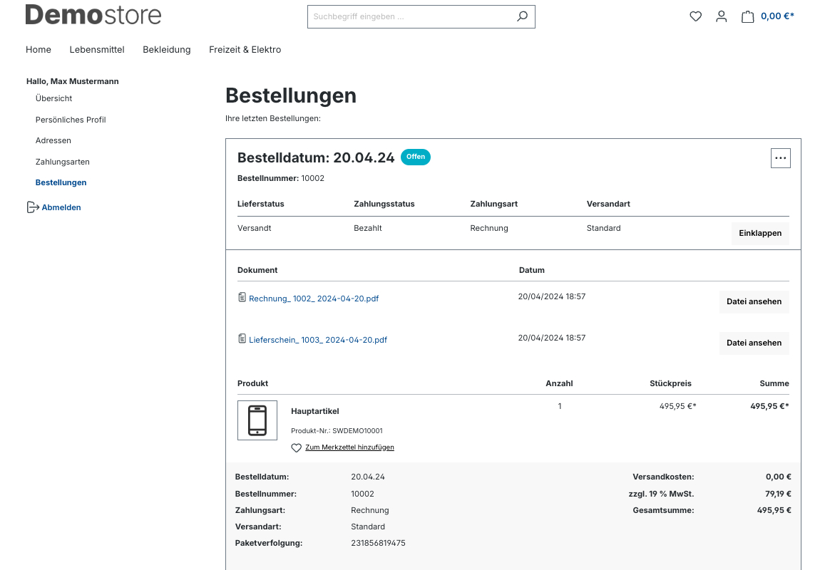 Damit ein Kunde die Belege einer Bestellung wie die Rechnung nicht nur in seinem E-Mail-Postfach finden kann, sollten diese auch im Kundenkonto bereitgestellt werden und herunterladbar sein.