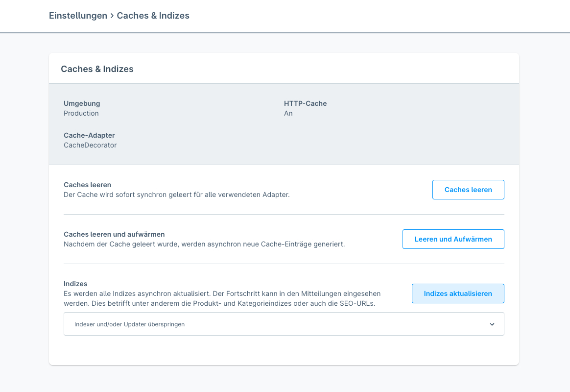 Sobald alle gewünschten Änderungen vorgenommen wurden, muss der sogenannte SEO-Index neu aufgebaut werden, um die URLs zu aktualisieren. Dies kann man auf zwei verschiedenen Wegen erreichen: entweder betätigt man dazu die Schaltfläche "Indizes aktualisieren" unter "Einstellungen", "System" und "Caches & Indizes" oder führt über die Konsole den Befehl php bin/console dal:refresh:index aus.