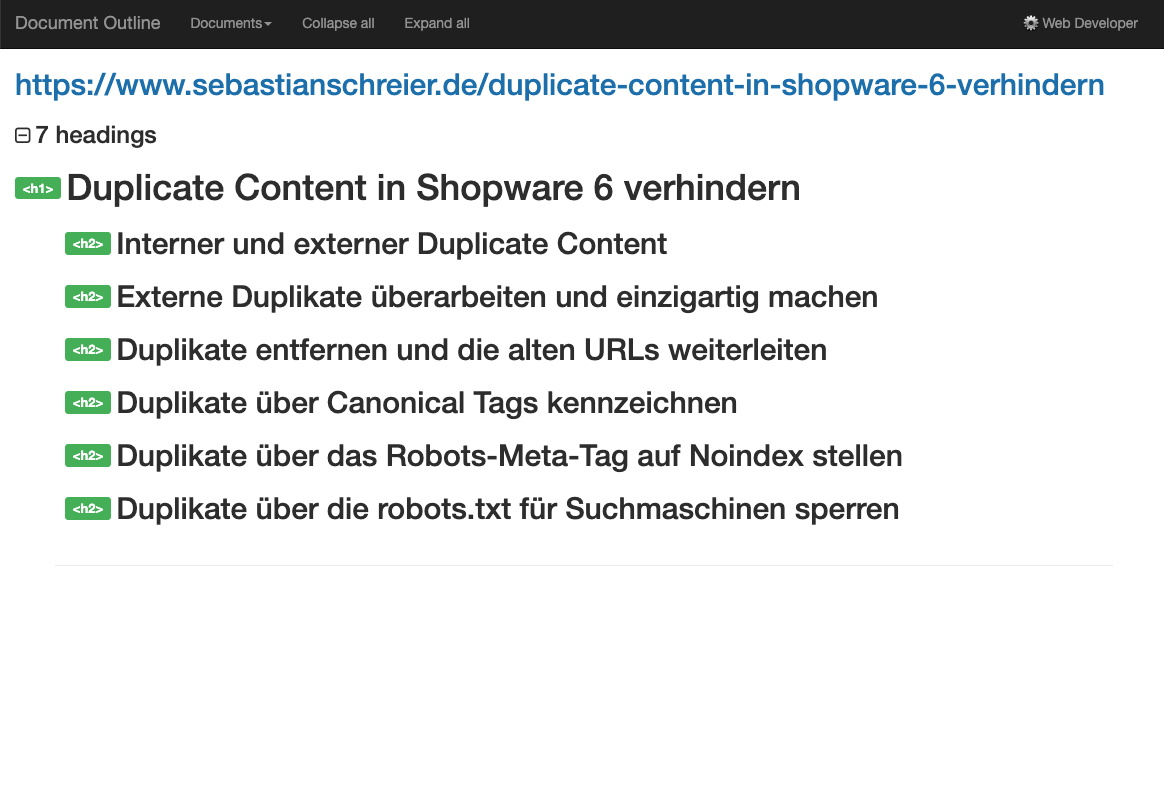 Über die Google Chrome-Erweiterung Web Developer kann man sich einen schnellen Überblick über den Inhalt einer Seite verschaffen. Der Menüpunkt "Information" und "View Document Outline" listet dazu beispielsweise alle Überschriften hierarchisch auf. Auch die Erweiterung SEO Pro Extension liefert diese Information unterhalb des Menüpunkts "Headings".