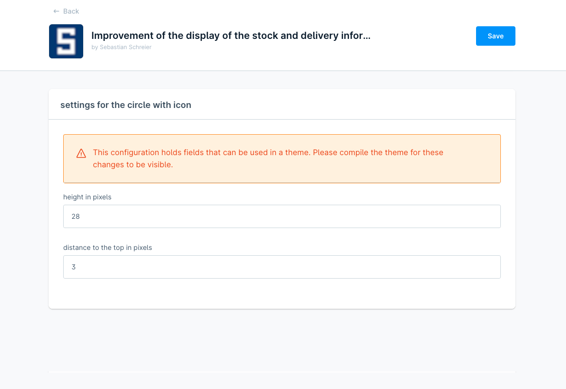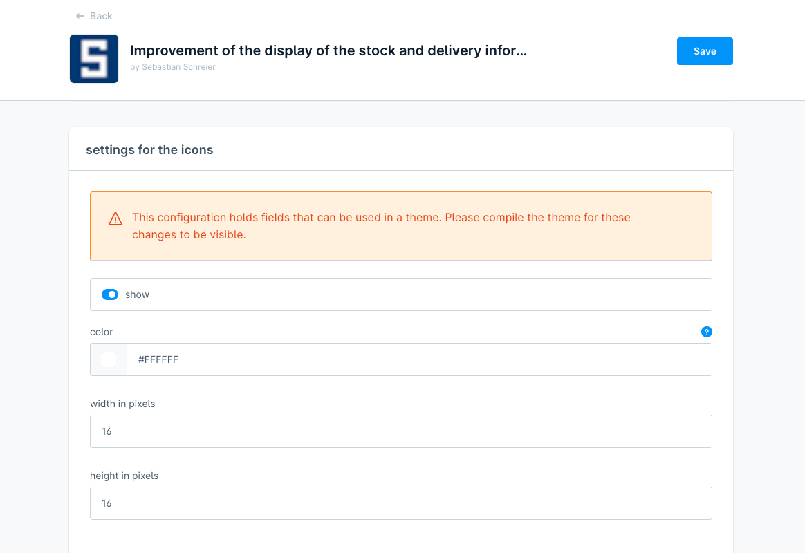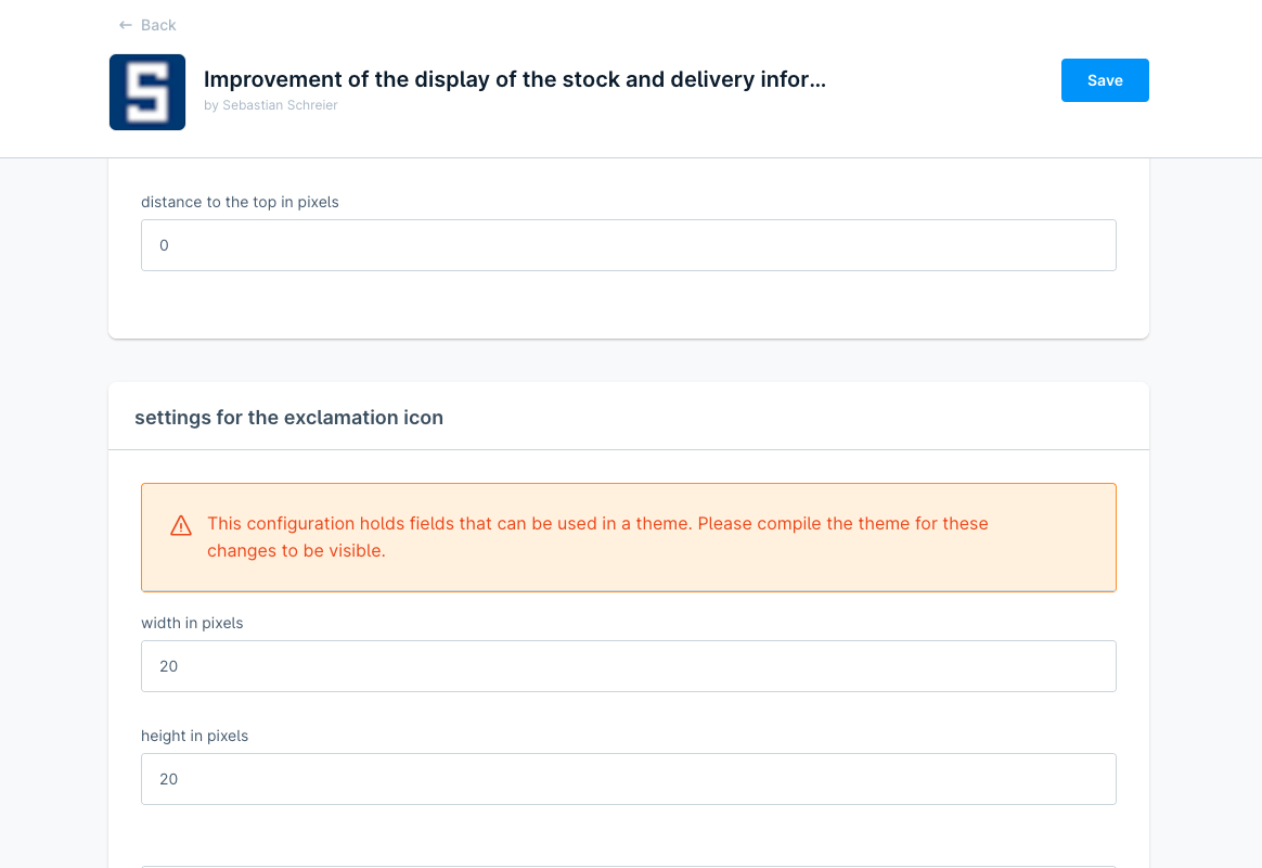Für die Icons kann die Farbe, die Breite, die Höhe und der Abstand nach oben in Pixeln festgelegt werden. Für das Ausrufezeichen kann man abweichende Einstellungen vornehmen.