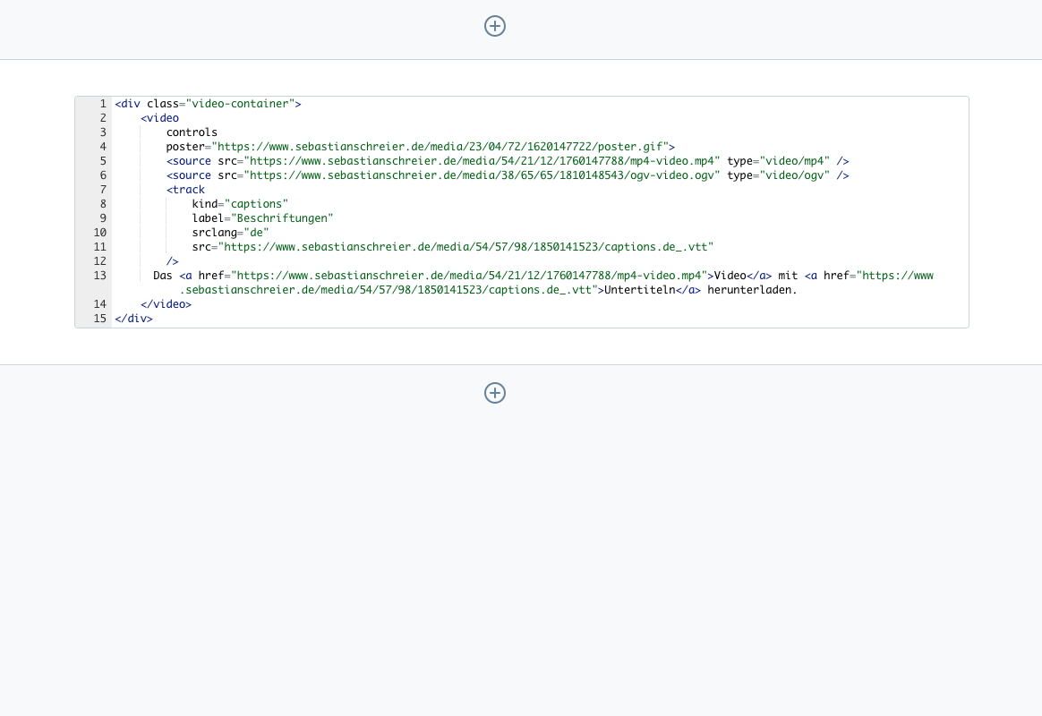 Ein HTML5-Videoelement kann über den CMS-Block "HTML" aus der Block-Kategorie "HTML" integriert werden. Der Inhalt könnte beispielsweise folgendermaßen aufgebaut sein: