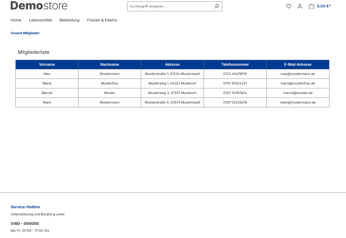 <table class="sw-text-editor-table" summary="Die erste Zeile zeigt die Überschriften, alle weiteren Zeilen listen die Mitglieder mit Vor- und Nachnamen, der Adresse, der Telefonnummer und der E-Mail-Adresse auf.">
