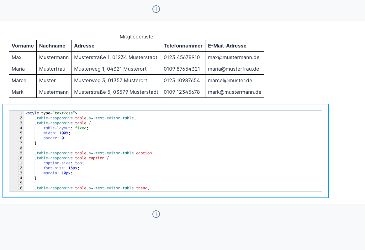 Der CSS-Code für die Gestaltung der HTML-Tabelle und für die Beschriftungen in den kleineren Auflösungen kann entweder im eigenen Theme abgelegt oder im CMS-Block "HTML" aus der Block-Kategorie "HTML" hinterlegt werden.
