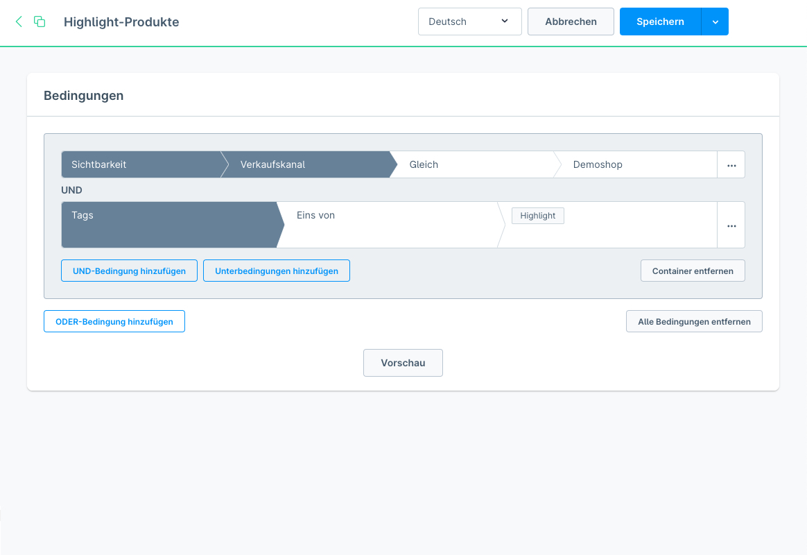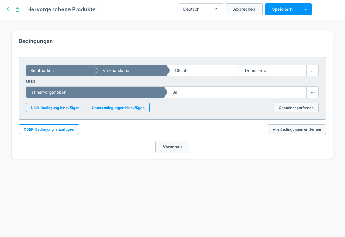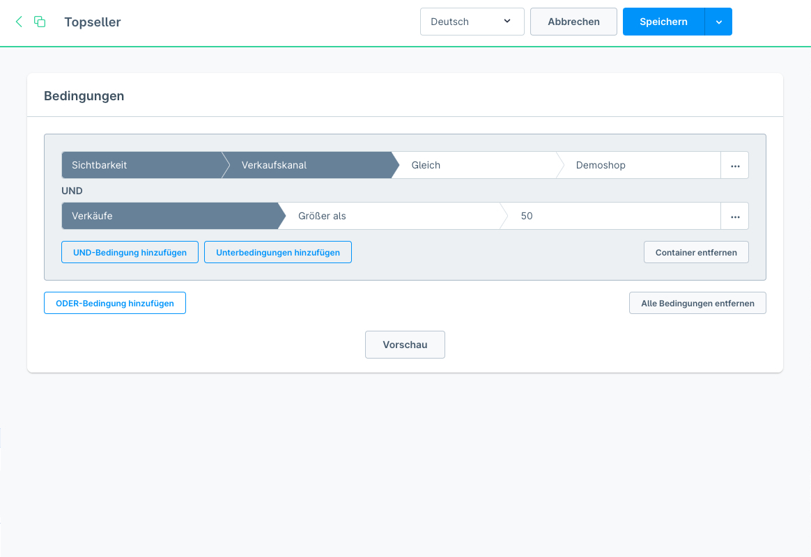 Auch eine Vielzahl an anderen Slidern sind auf diese Weise möglich, beispielsweise ein Hersteller-Slider über die Bedingung "Hersteller", "Gleich" und den Wert "shopware AG" oder ein Slider, dessen Produkte sich anhand einer Eigenschaftsausprägung wie "fair" oder "nachhaltig" ermitteln. In diesem Fall wählt man die Bedingung "Eigenschaften", "Eigenschafts-Ausprägung", "Gleich" und den Wert "nachhaltig: Ja" aus.