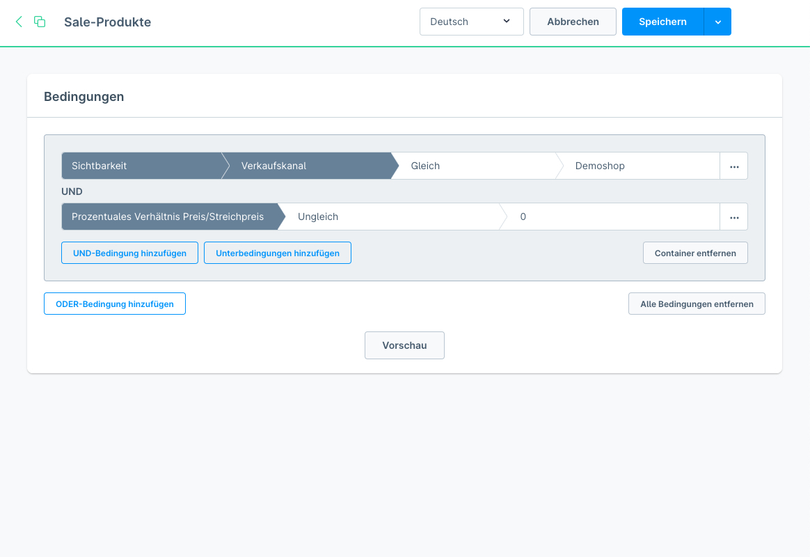 Um sich in Shopware 6 einen Produkt-Slider für gerade im Sale befindlichen Produkte anzeigen zu lassen, muss im Vorfeld eine dynamische Produktgruppe unter "Kataloge" und "Dynamische Produktgruppen" erstellt werden. Im nächsten Schritt legt man die Bedingungen fest, die die Produkte erfüllen müssen, um beim Produkt-Slider mit aufgelistet zu werden. In diesem Fall wären es die Bedingungen "Sichtbarkeit", "Verkaufskanal", "Gleich" mit dem Wert "Demoshop" und "Prozentuales Verhältnis Preis/Streichpreis", "Ungleich" mit dem Wert "0".