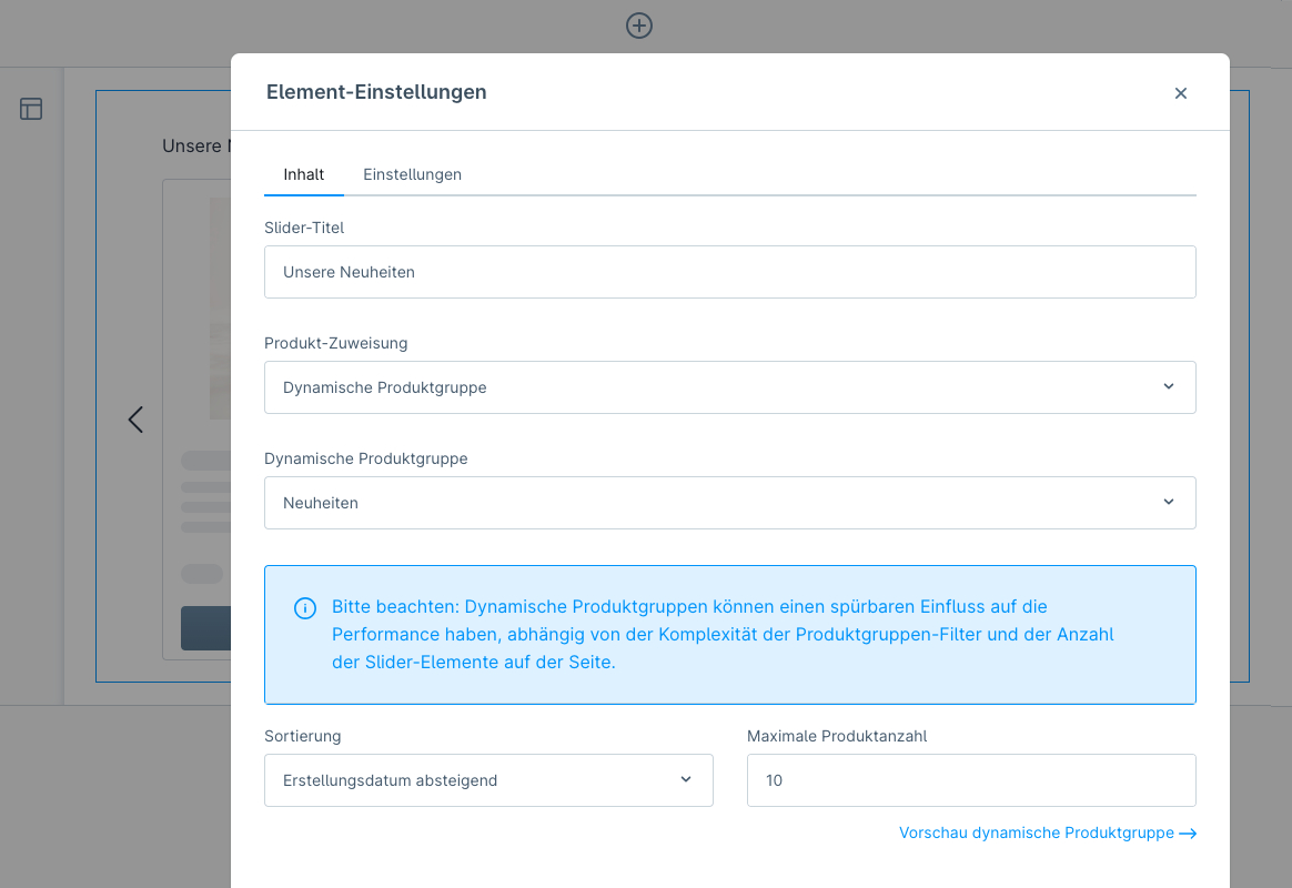 Im Anschluss wird der CMS-Block "Produkt-Slider" aus der Block-Kategorie "Commerce" in dem Layout platziert, in dem er angezeigt werden soll. Zuallerletzt muss man im Tab "Inhalt" nur noch folgende Werte auswählen: