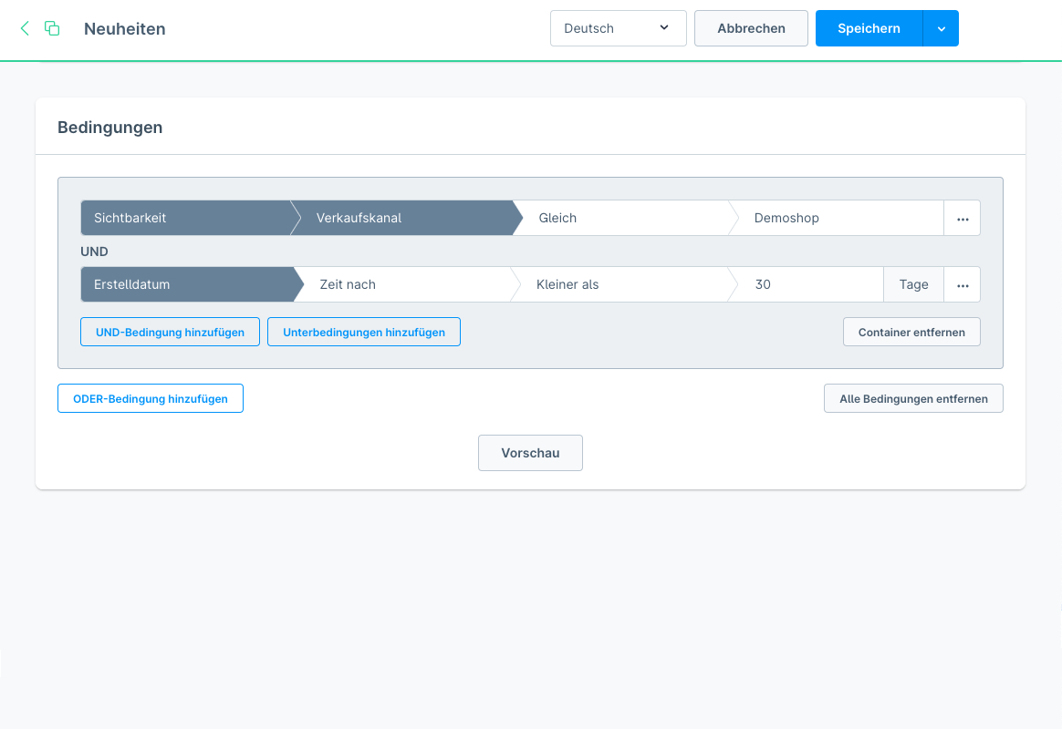 Um in Shopware 6 einen Produkt-Slider für die Neuheiten zu erstellen, muss zuallererst eine sogenannte dynamische Produktgruppe unter "Kataloge" und "Dynamische Produktgruppen" angelegt werden. Im nächsten Schritt legt man die Bedingungen fest, die die Produkte erfüllen müssen, um beim Produkt-Slider mit aufgelistet zu werden. In diesem Fall wären es die Bedingungen "Sichtbarkeit", "Verkaufskanal", "Gleich" mit dem Wert "Demoshop" und "Erstelldatum", "Zeit nach", "Kleiner als" mit dem Wert "30". Alternativ besteht auch die Möglichkeit, bei der Bedingung statt dem "Erstelldatum" gleich das "Erscheinungsdatum" auszuwählen. Mit dieser Konfiguration enthält der Produkt-Slider automatisch alle Produkte, die in den letzten 30 Tagen erstellt wurden oder erschienen sind. Insofern das Erstelldatum ausgewählt wurde und die Produkte automatisch mit dem Badge "NEU" gekennzeichnet werden sollen, sollte das Erscheinungsdatum und das Erstelldatum gleich sein.